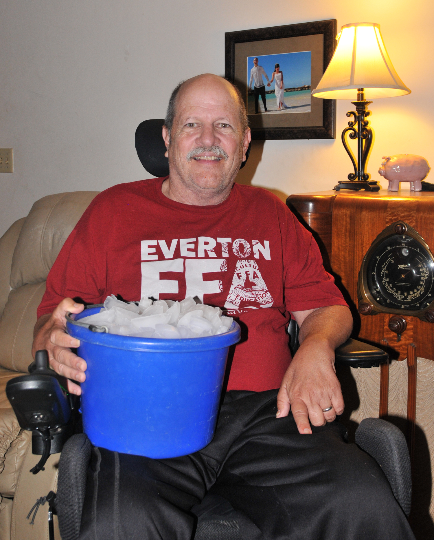 And the view keeps changing. That’s one of the unrelenting evils of ALS, that it does its work so damn methodically. The Ice Bucket Challenge is supposed to be as much about education as it is about money, so here’s the short story of how the disease works: Something kills the spinal cord nerves feeding the voluntary muscles, and when the nerves die, so do the muscles. We don’t know what that destructive mechanism is, although smart scientists have made some very good guesses, but we can see the effects of the nerve degeneration on the body. Let me make that passive statement more personal. My husband’s ALS started with a prickly feeling in his legs. That was it three years ago, just that prickly feeling, some cramping and leg twitches, and a sense the floors were doing their best to trip him up. The twitches moved up to his abdomen. And now his arms. Three years ago he could walk unassisted, although he might lean on my shoulder if the ground was soft. Two years ago he started using a cane. A year ago he went to a wheelchair full-time. Truly something wicked this way comes and we know what will be affected next, but we try not to go there because today is manageable. Today is okay; why worry about tomorrow?