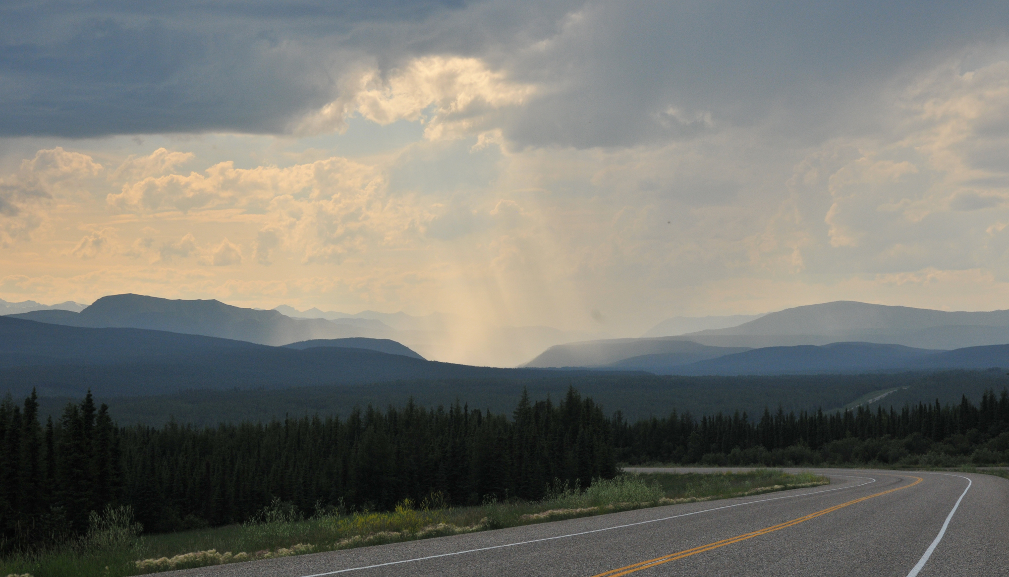 We were in the Yukon. Can you imagine how thrilling it is for me to so casually type those words? We were in the Yukon, a place where, according to poet Robert Service, surely the weak will perish, and every mile was leading us deeper into the wild. Mountains lay ahead, with thunderclouds hanging low above the peaks, and as we climbed toward Summit Lake Pass the clouds played games with the sun, parting only long enough to let a shaft of light fill the valley below. Good asphalt turned to gravel just before the pass and after a mile of that bumpy road, a lady in a road crew vest waved us to a stop. It’ll be a good long wait, she warned us. A few cars piled up behind our van as we chatted with the woman. She was from somewhere far south but she liked her work, she said, and we could tell it was true because she bubbled with the sheer joy of holding a stop sign on a dusty Yukon road. The clouds let loose while we were talking to her, big drops at first and then the hail, a torrent of it pounding down. Get in our van, I said, but she had her hard hat and her job to do. It kept hailing. I can hold the stop sign from my window, I said—get out of the rain. With the ice falling all around her, bouncing on what was gravel and turning the rest to mud, our road crew lady just grinned an impish grin, held her hands up to the hail, and she danced.