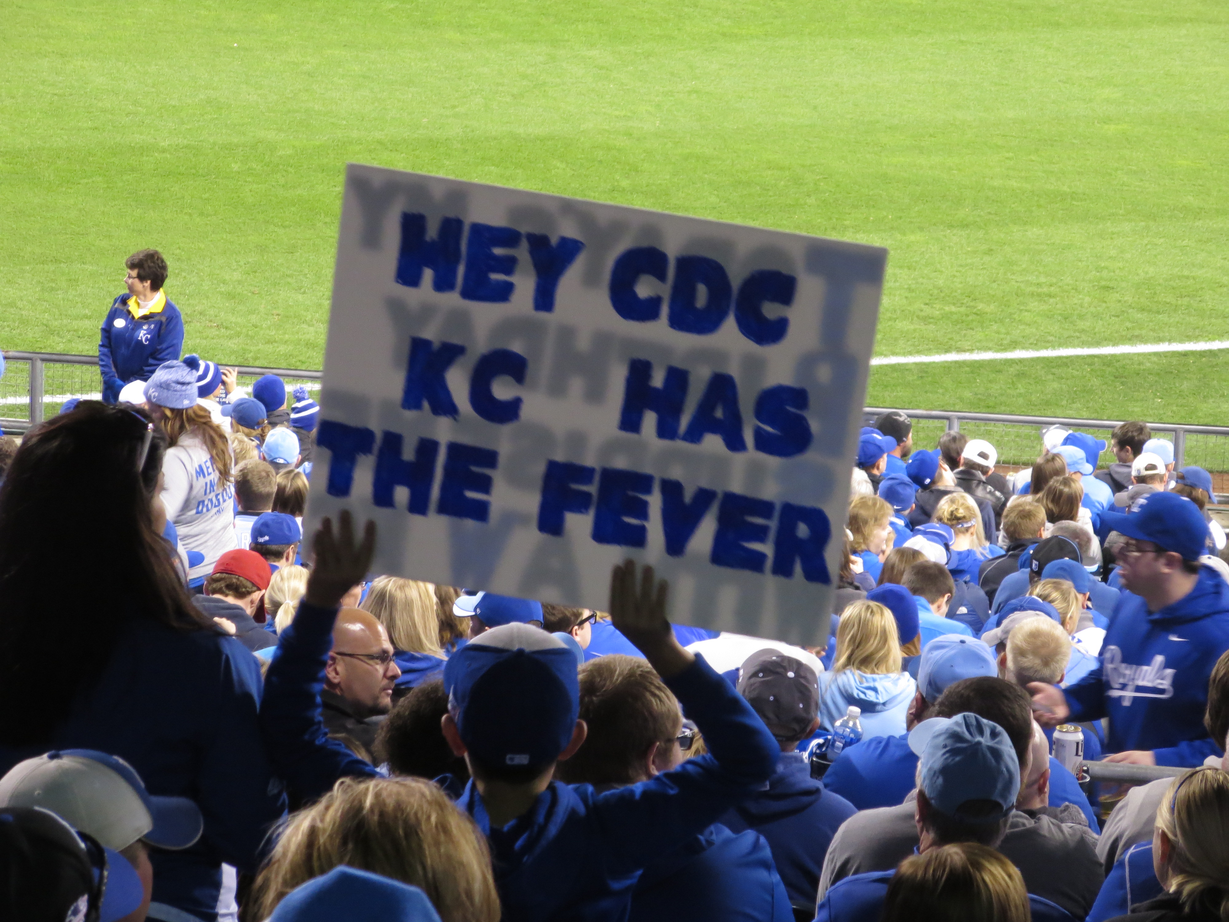 And that’s why the CDC needs to keep on eye on Kansas City. They have the fever, and it’s a love fever, baby–pure love. We were there Tuesday night too, my husband and I, hanging over the rail in section 212 and whooping like crazy right along with the sea of blue. Rally flags swirled. Everybody high-fived. And way down on the field some pretty decent men played some seriously awesome baseball. Not that I saw it all from our vantage point–we missed Moustakas’ head dive into the box seats, dang it–but what we missed of the game was nothing compared to what we felt from the crowd. Unadulterated joy.
