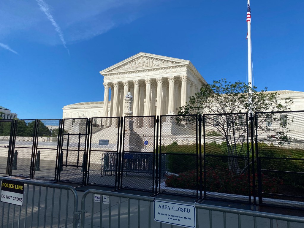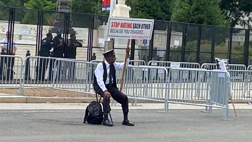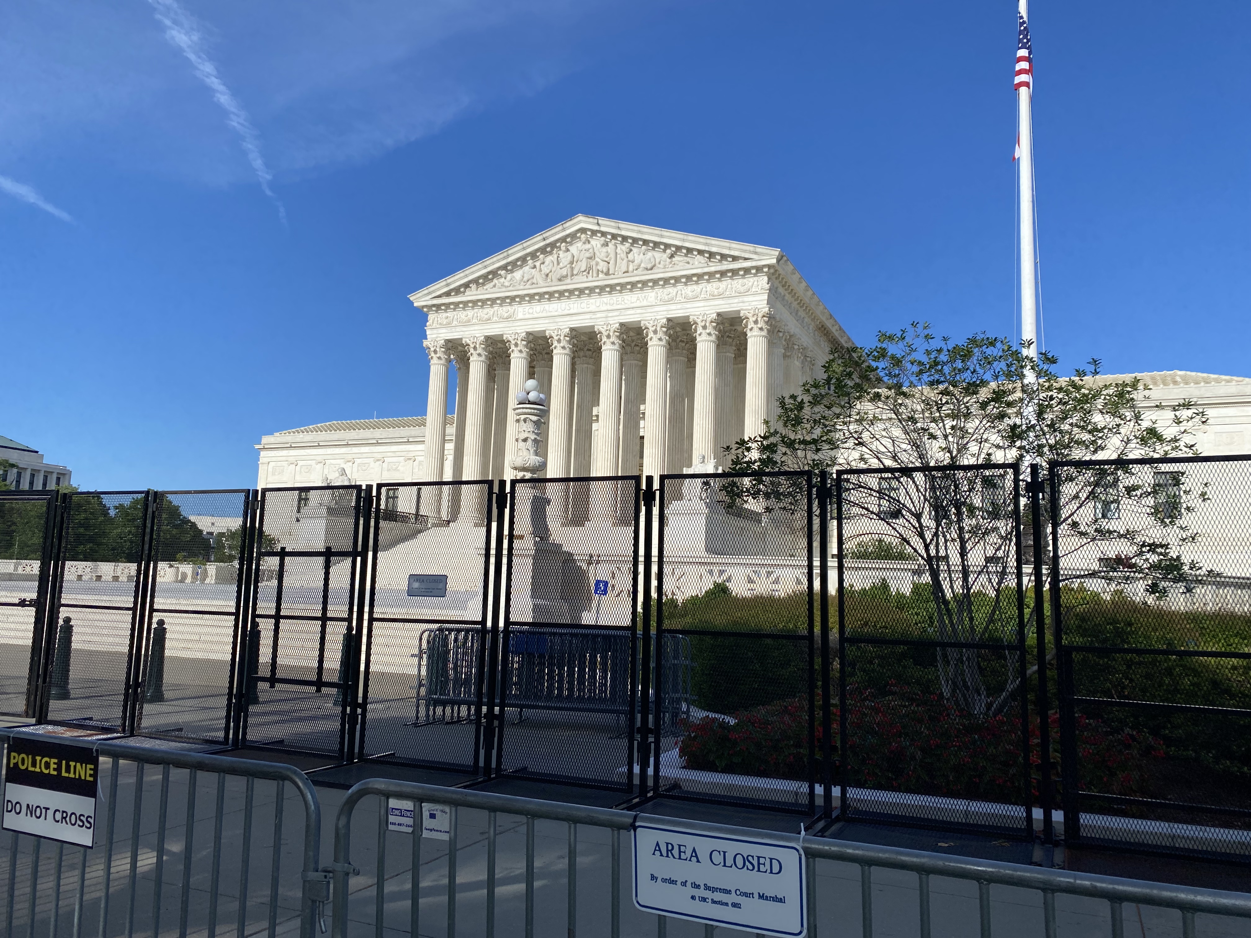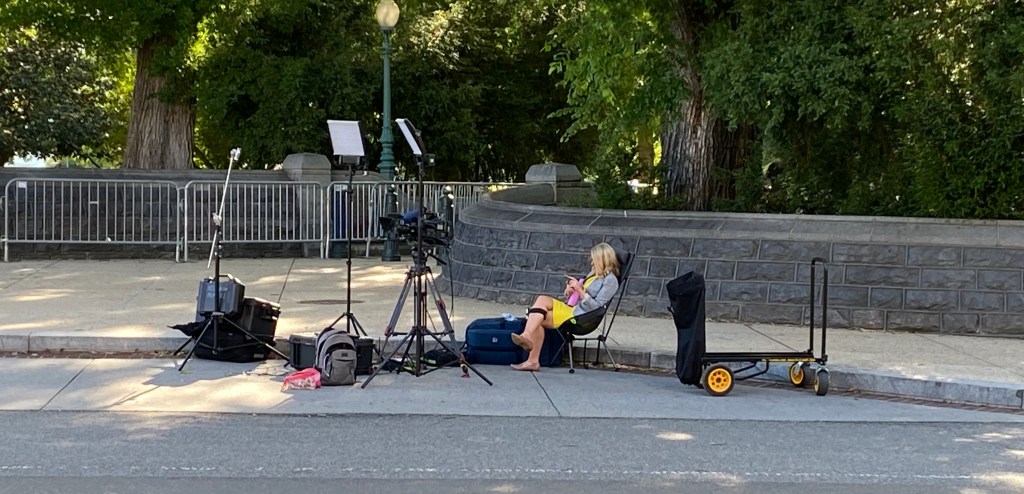Notice the formidable fencing? My friend Pam and I passed this way in late June, only a few days before the Supreme Court released the Dobbs decision overturning Roe vs Wade. Small groups of demonstrators were already out in the street behind us, although most of them were evangelicals praying for the ruling to come down as it did. On the other side of the street, enduring the boredom probably nobody promised her in journalism school, was a reporter just patiently waiting: